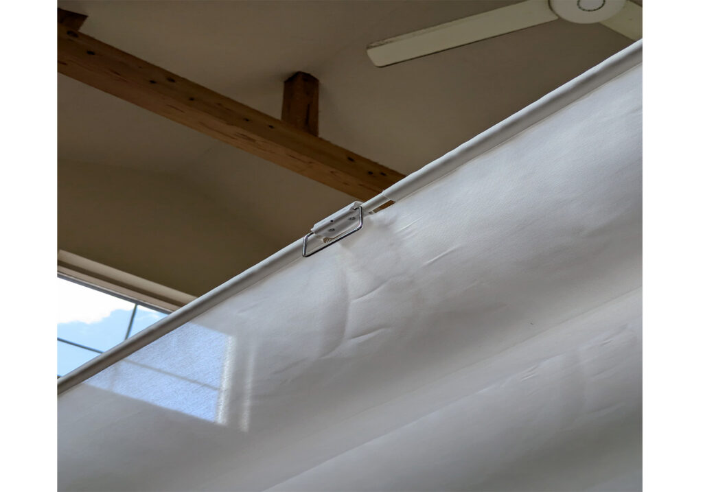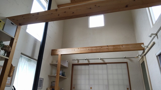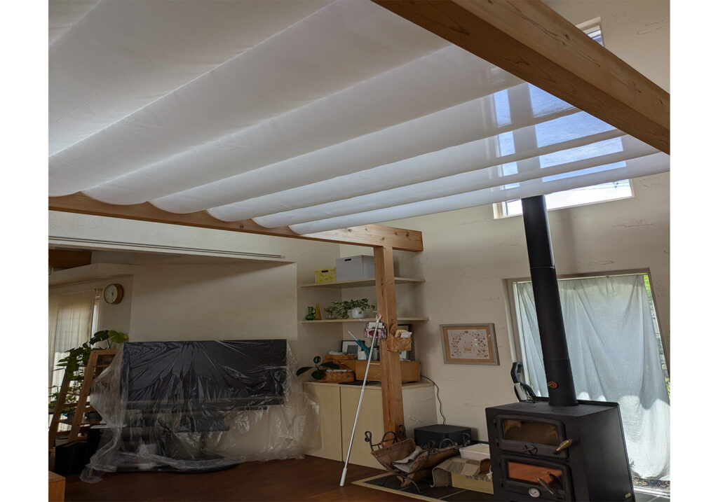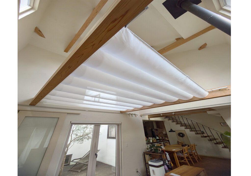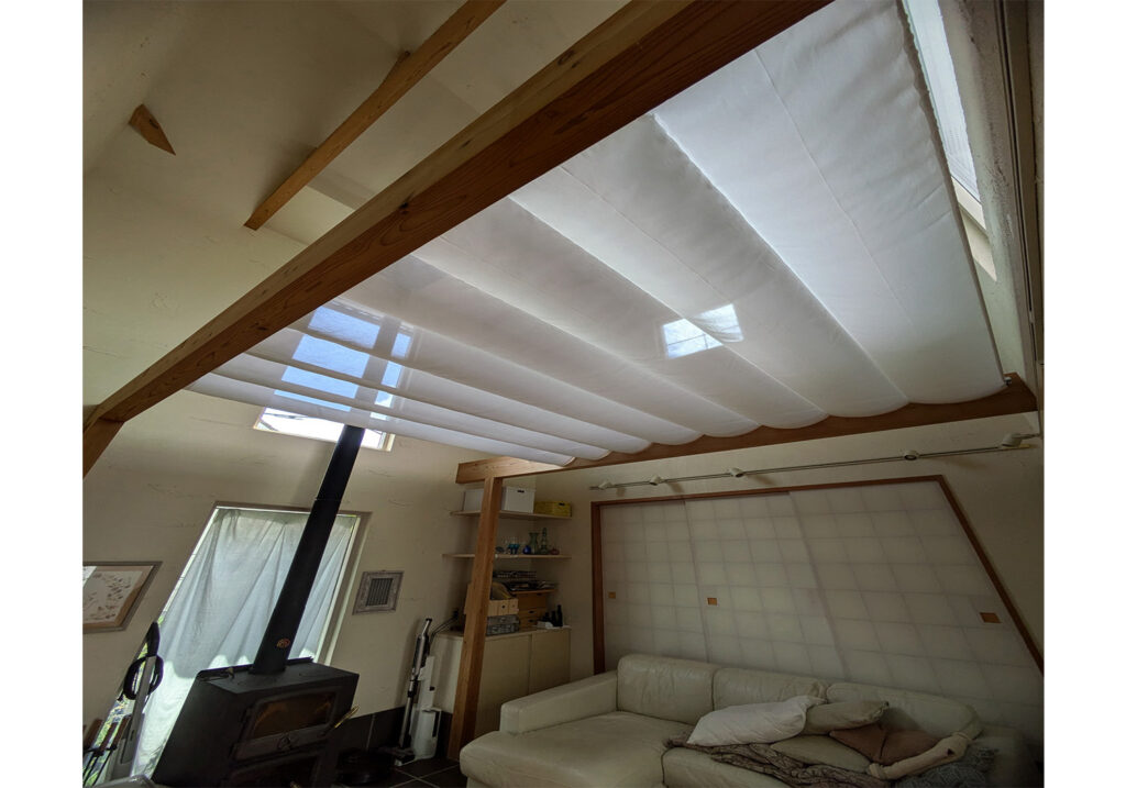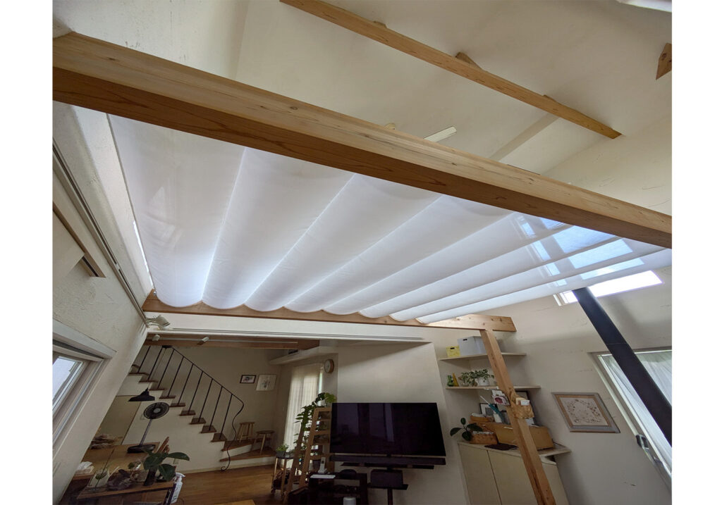 暖かい空気は上に昇るため、高天井や吹き抜けでは、暖房をつけても暖気が天井付近に溜まりやすく、床面は寒いままになりがちです。そこで、今回造作した天幕カーテンが、天井と居住空間の間にファブリックの層を作り、暖かい空気をせき止める役割を果たします。