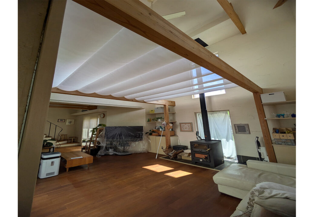 空間のアクセント: 木の梁と、柔らかなファブリックのドレープが、部屋全体に温かみのある上質で洗練された雰囲気をもたらします。採光確保: 明るい色のファブリックを使用しているため、光を取り込みながらも、夏の強い日差しは適度に和らげる効果も期待できます。「冬の寒さ」という実用的な問題を、おしゃれなインテリアとして解決した、T様邸ならではの成功事例です。「冬でも快適に過ごせるようになり、リビングで過ごす時間が長くなりました」と、大変ご満足いただいております。
