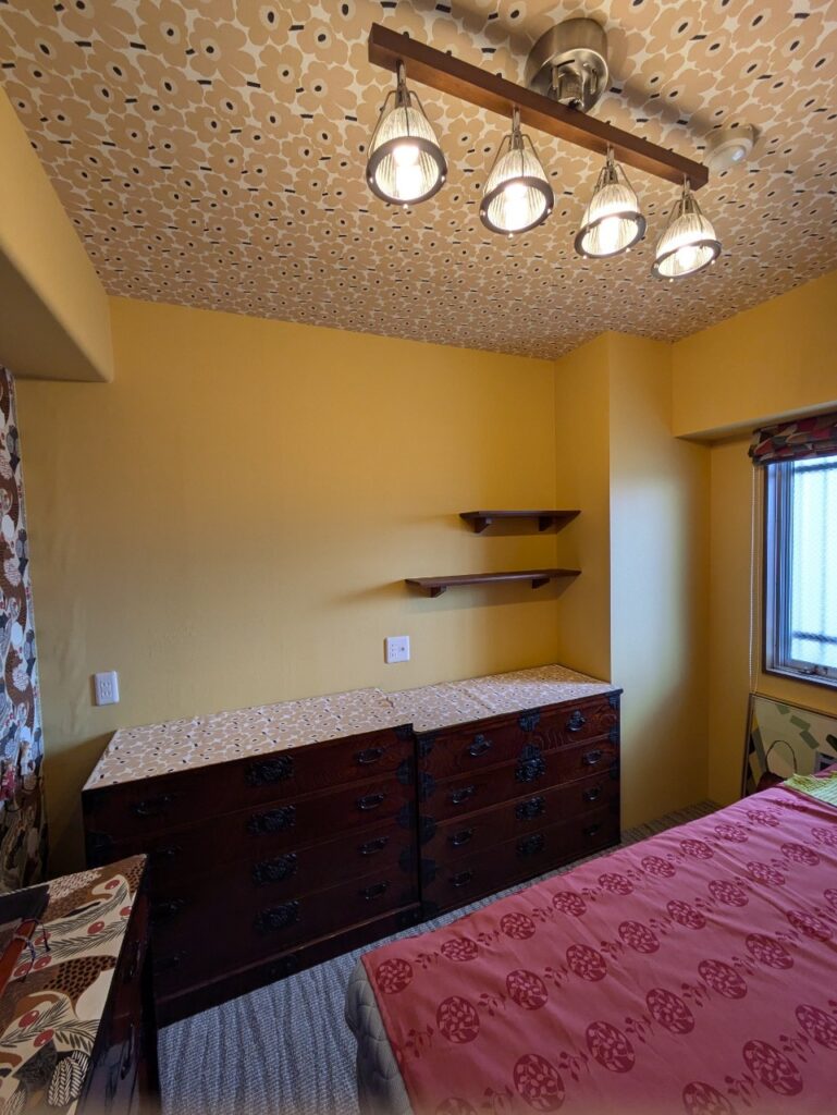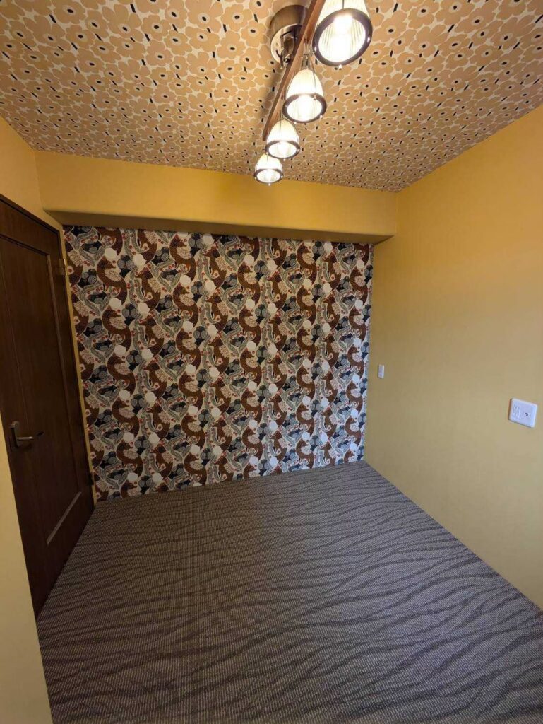 ポイント: この事例のように、ダウンライトで壁紙を照らすと、柄の陰影が美しく浮かび上がります。アクセントクロスを貼る際は、一緒に照明プランも見直すことで、空間の完成度が格段に上がります。